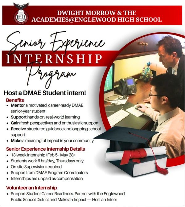 Englewood Public Schools invites local businesses and professionals to partner with us by hosting Senior Experience Interns from Dwight Morrow High School. Your mentorship can influence and prepare the next wave of professionals. Interested? Fill out our interest form or contact us for more information.